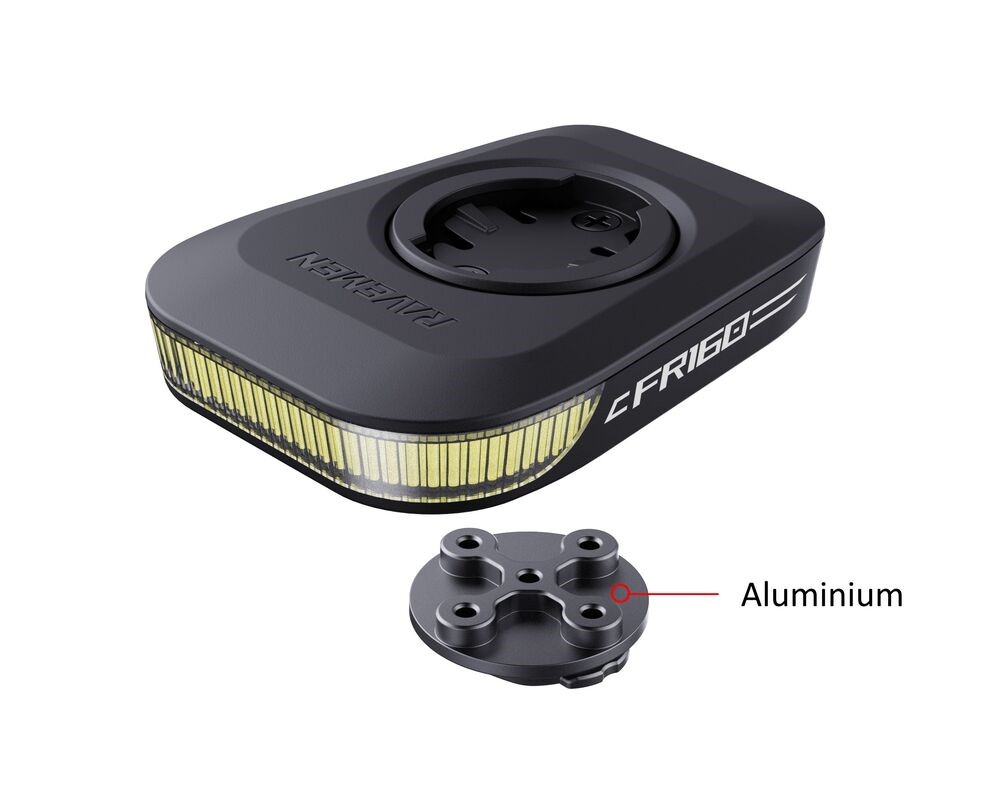 FR160 je lehké a snadno použitelné denní světlo. Díky pásu LED COB diod poskytuje maximálně 160 LED lumenů v režimu výstražného blikání, který je viditelný až ze vzdálenosti 700 metrů, což je skvělé pro dojíždění do práce nebo jízdu ve městě ve dne i v noci. Světlo je kompatibilní s držáky pro Garmin, příp. s dalším dostupným adaptérem pro Wahoo a Bryton. Odolnost proti dešti je na úrovni IPX6 a nabíjení probíhá portem USB-c. Verze s hliníkovým adaptérem je vhodná zejména pro větší a těžší cyklocomputery jako je např. Garmin řady 10XX. Vysoce účinné LED diody COB s maximálně 160 lumeny. Výstražný záblesk pro denní jízdu viditelný až ze vzdálenosti 700 metrů. Automatický úsporný režim a indikátor vybité baterie. Nabíjecí port USB-C pro snadné nabíjení světla. Kompaktní design a nízká hmotnost. Inteligentní paměťový obvod s pamětí poslední použité úrovně jasu při opětovném zapnutí. Konstrukce s rychlým upevněním pro snadné zasunutí a vysunutí. Voděodolnost IPX6 pro použití i při silném déšti. Pás COB LED diod. Dobíjecí lithium-polymer baterie 380 mAh / 3,7 V. Rozměry svítidla: 75 mm x 57 mm x 21 mm Hmotnost: 55 g