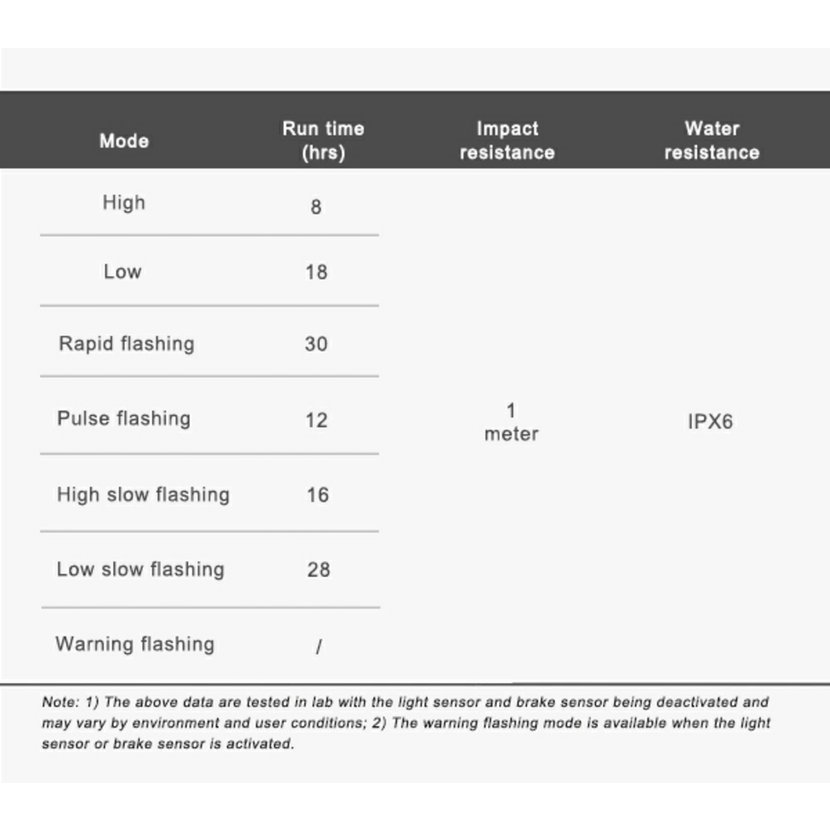 CL06 je lehké a snadno použitelné zadní světlo. Díky čtyřem sadám LED COB poskytuje maximálně 50 LED lumenů v režimu výstražného blikání, který je viditelný až ze vzdálenosti 650 metrů, což je skvělé pro dojíždění do práce nebo jízdu ve městě ve dne i v noci. Díky flexibilnímu držáku s gumovým popruhem a montážní sponě je světlo kompatibilní s kulatými i aero sedlovkami, nebo může být připnuto přímo na některé podsedlové či jiné brašny. Vysoce účinné LED diody COB s maximálně 50 lumeny. Vestavěný světelný senzor pro aktivaci maximálního výkonu pro varování při detekci světlometů zezadu se blížících vozidel. Integrovaný brzdový senzor pro aktivaci maximálního výkonu pro varování při brzdění. Automatický úsporný režim a indikátor vybité baterie. Nabíjecí port USB-C pro snadné nabíjení světla. Kompaktní design a nízká hmotnost. Inteligentní paměťový obvod s pamětí poslední použité úrovně jasu při opětovném zapnutí. Konstrukce s rychlým uvolněním pro různé způsoby montáže. Voděodolnost IPX6 pro použití i při silném déšti. 4 sety COB LED diod. Dobíjecí lithium-iontová baterie 500 mAh / 3,7 V. Rozměry svítidla: 43 mm x 22,5 mm x 44 mm Hmotnost: 31 g Kompatibilní s kulatými a aero sedlovkami o průměru 24 - 36 mm.